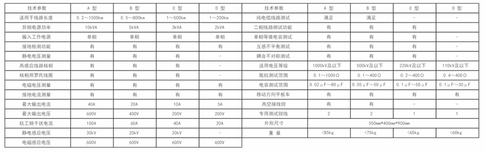 1.选择适用于不同工频干扰强度及线路长度的规格型号:以 满足对0.2~1500km架空线路或电缆线路交流工频参数测试 需要。